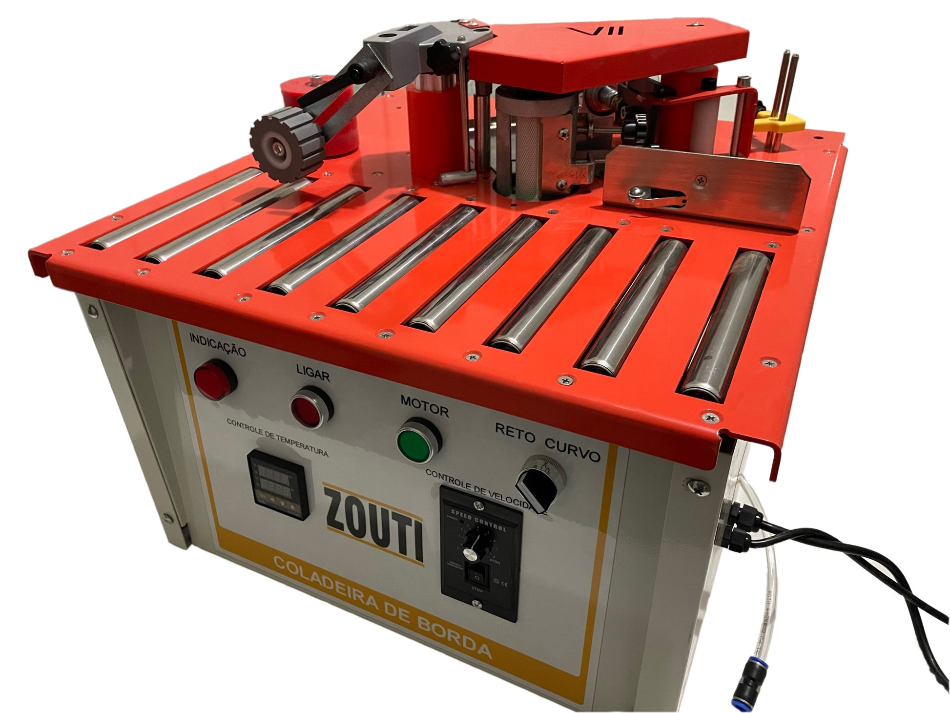 Com pedal de acionamento, possibilitando colar peças redondas ou com arestas facilmente e com o corte automático da fita via pedal.